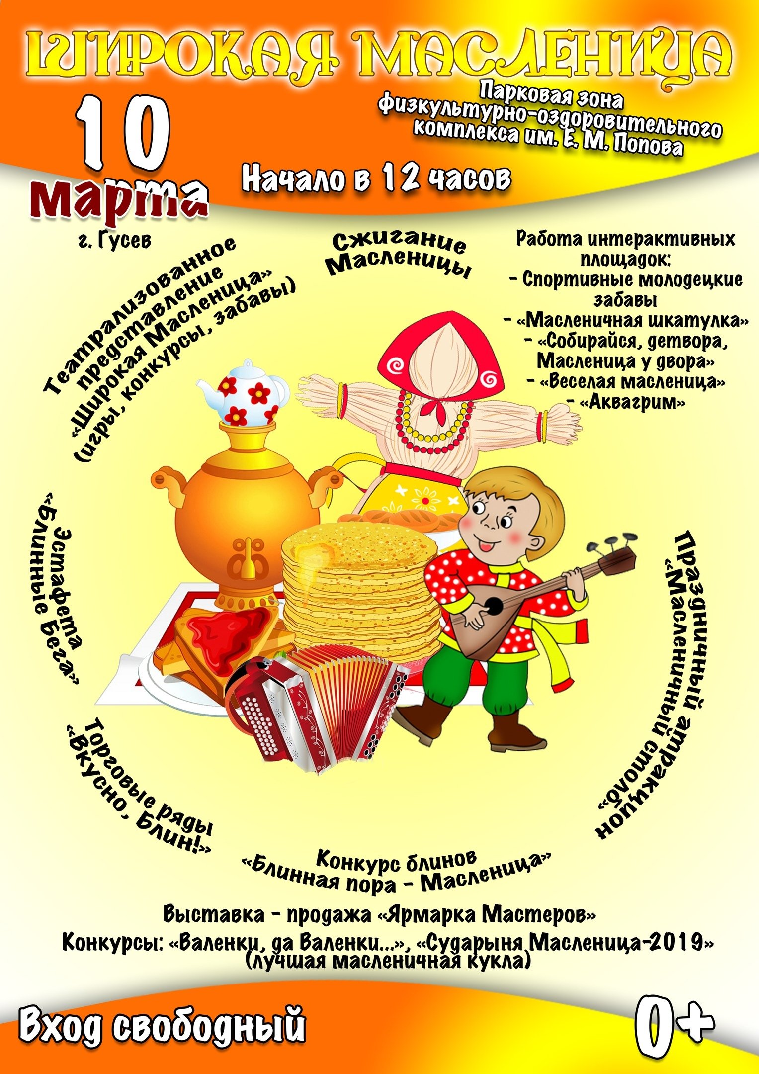 10 марта завершается Масленичная неделя. В этот день для гусевцев подготовлена интересная программа с народными гуляньями, забавными конкурсами, театрализованными представлениями, аттракционами и традиционным сжиганием чучела. Место проведения мероприятия — парковая зона ФОКа. Начало в 12.00 часов